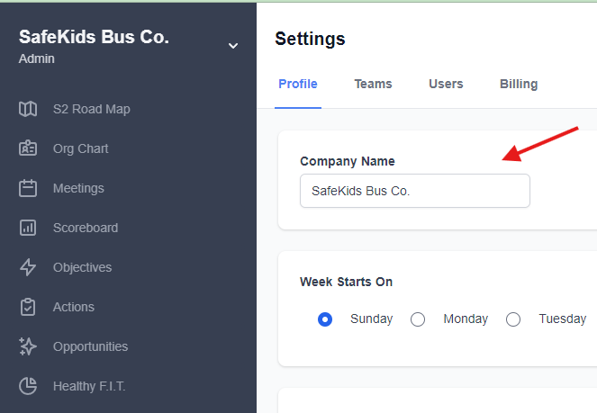 4. On the "Profile" tab, you can edit your company name. This can be adjusted or edited at any time.
