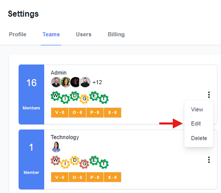 3. Choose any existing team and click the 3 dots to the right and click "Edit"