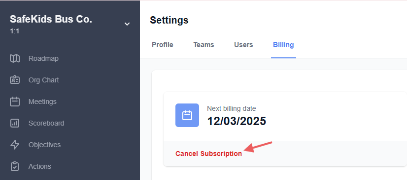 How can I cancel my subscription to S2 Sync? 1. Click your company name on the upper left part of the page. 2. Select Company Settings. 3. Go to Billing. 4. Click on the Cancel Subscription button.