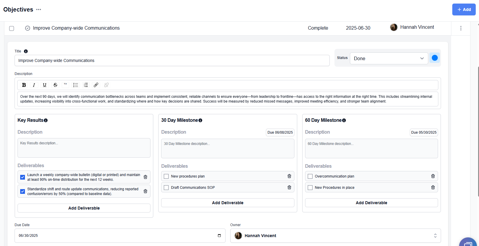 4. Fill in the title and description. You can also click "Fill out additional details" to add key results, 30-day milestones, 60-day milestones, etc.