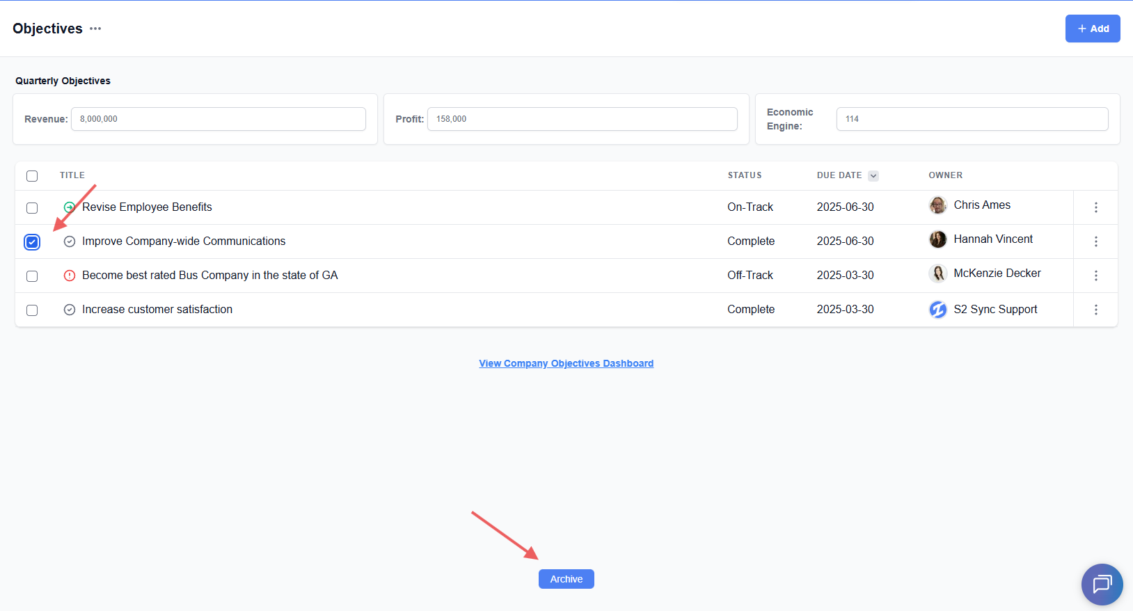 Need to archive an old objective? Navigate tothe objectives page, find the objective you'd like to archive, click on the check box to the left of the title, and click on "archive" on the bottom of the page.