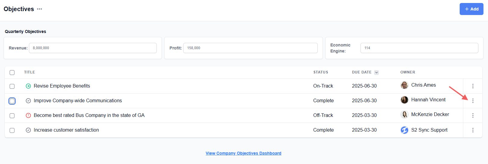 Need to edit? To edit an existing objective, navigate back to the main objectives page, find the objective you'd like to edit, and click on the 3 dots to the far right and choose "Edit."