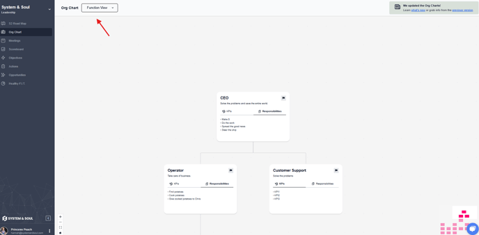 The Function View of the org chart provides a structured overview of each role within the organization. In this view, users can see and update key elements such as the function name, mission, KPIs, key responsibilities, and current status (filled, open, or interim).