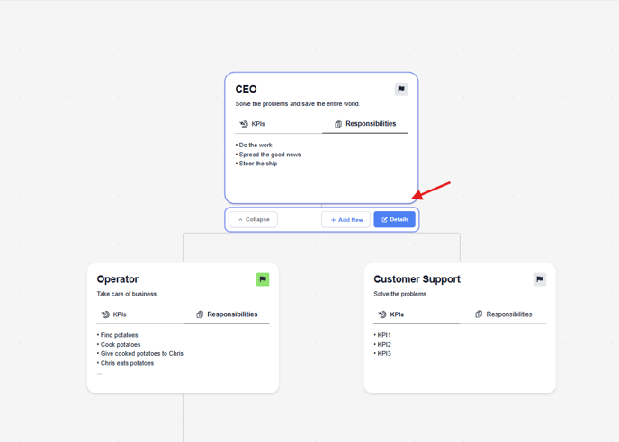 To make updates or view more information, simply click on a person's card within the org chart. The card will outline blue, and then you can click on "Details." This will open the function details, where you can view and update the information as needed.