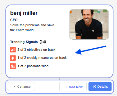 New on this view: When a User account is connected to a card or seat, you will see “Trending Signals” to demonstrate their status on Objectives and KPIs as well as how many open seats there are in this Function or department.