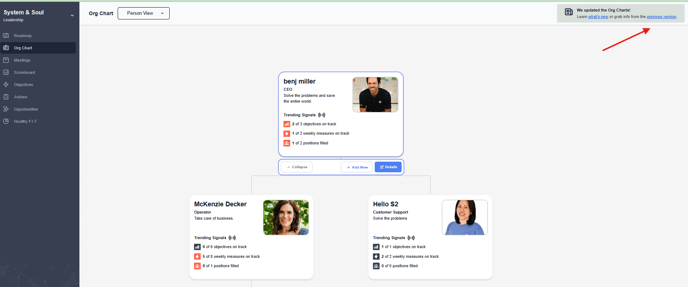 Yes! You can view the original version of your Org Chart by clicking the link located in the top right corner of your Org Chart page. Please note that this version is a static view and is no longer connected to the updated Org Chart. Any future edits should be made directly in the new version to ensure your information stays current.